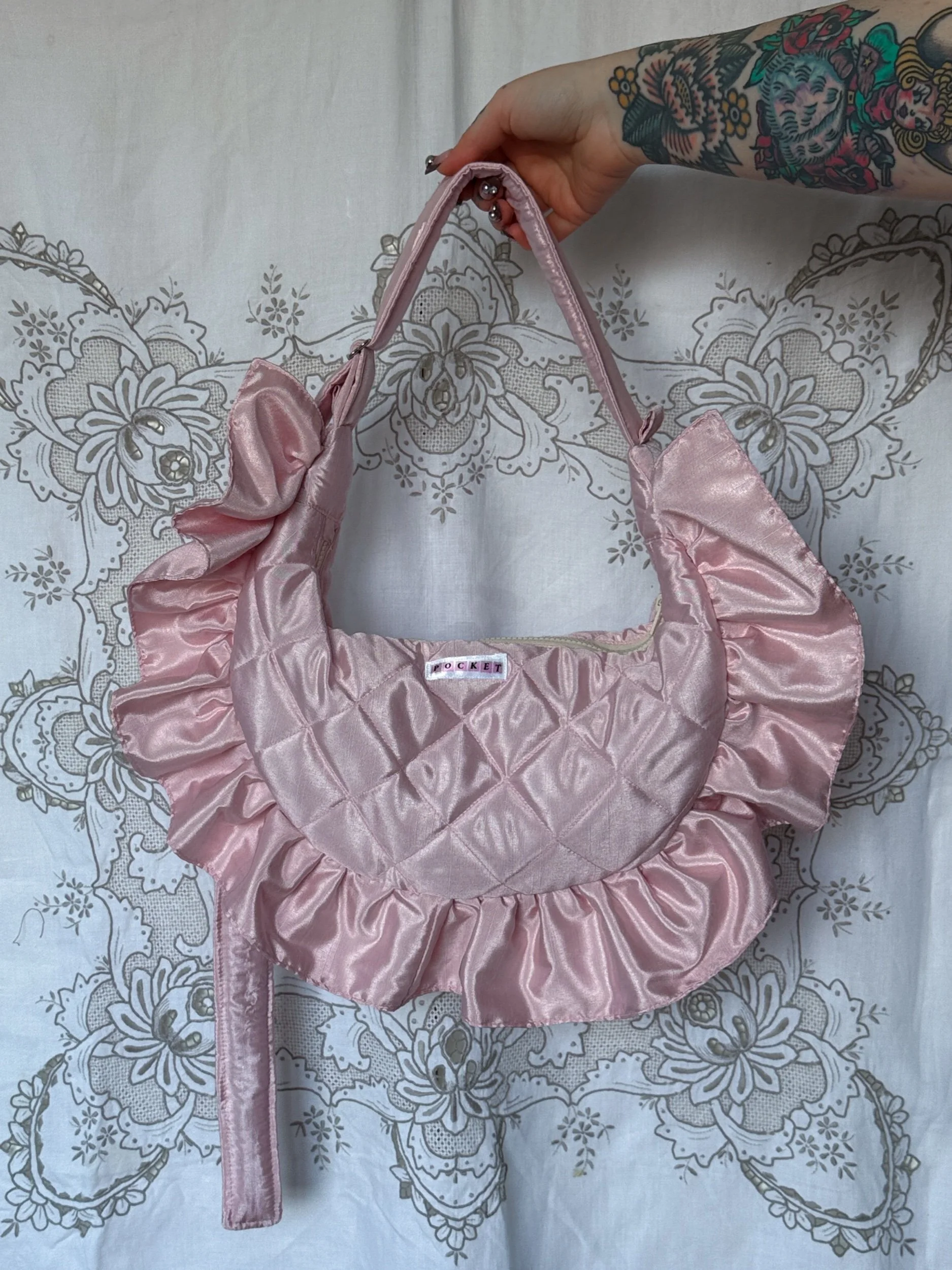 I have one of these pink satin frill bags available. Super long adjustable strap to be worn either short or as a cross body.